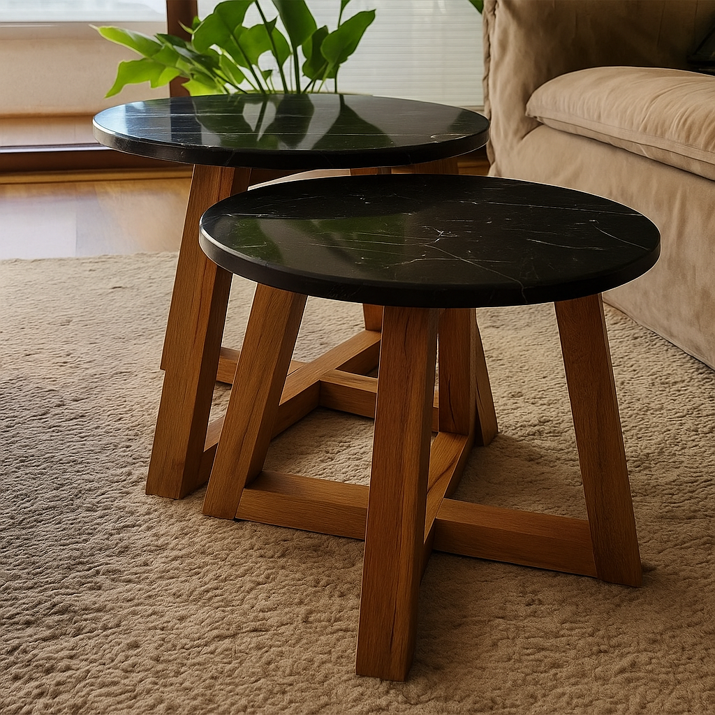 Estas mesas nido son parte de la nueva colección fabricada en madera nativa de lenga con suaves detalles chocolate y vetas rosas que son dignas de admirar