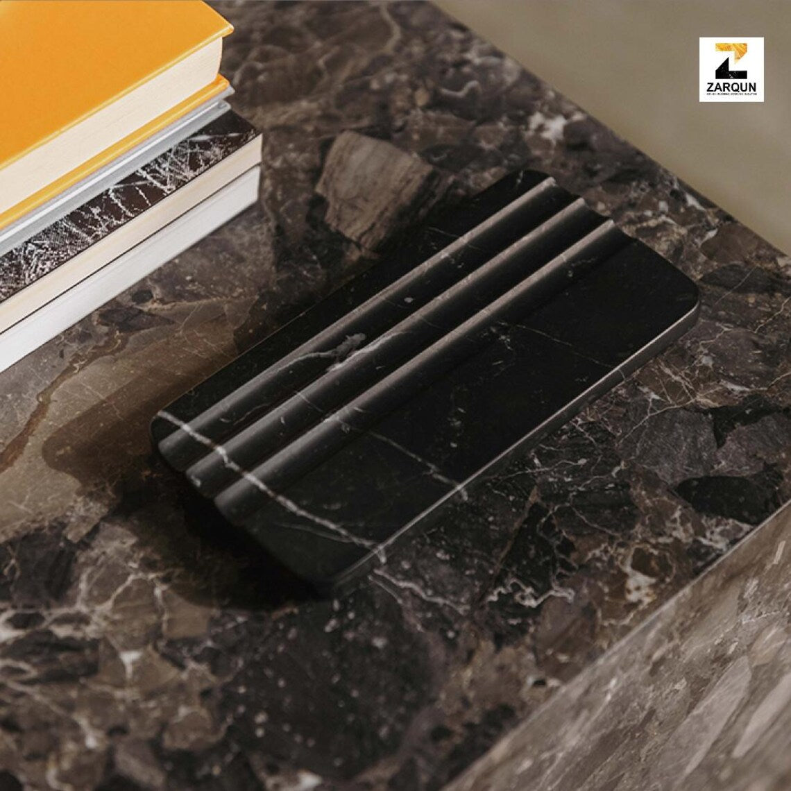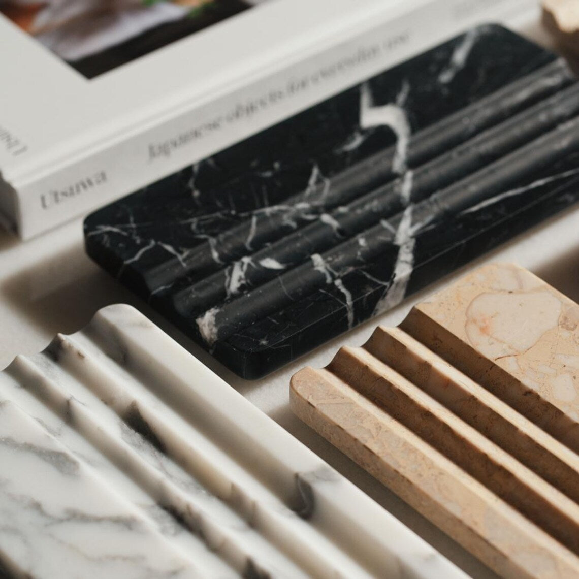 Cada pieza es única, tallada en auténtico mármol que exhibe vetas naturales y texturas orgánicas, convirtiendo un objeto cotidiano en una declaración de estilo minimalista.